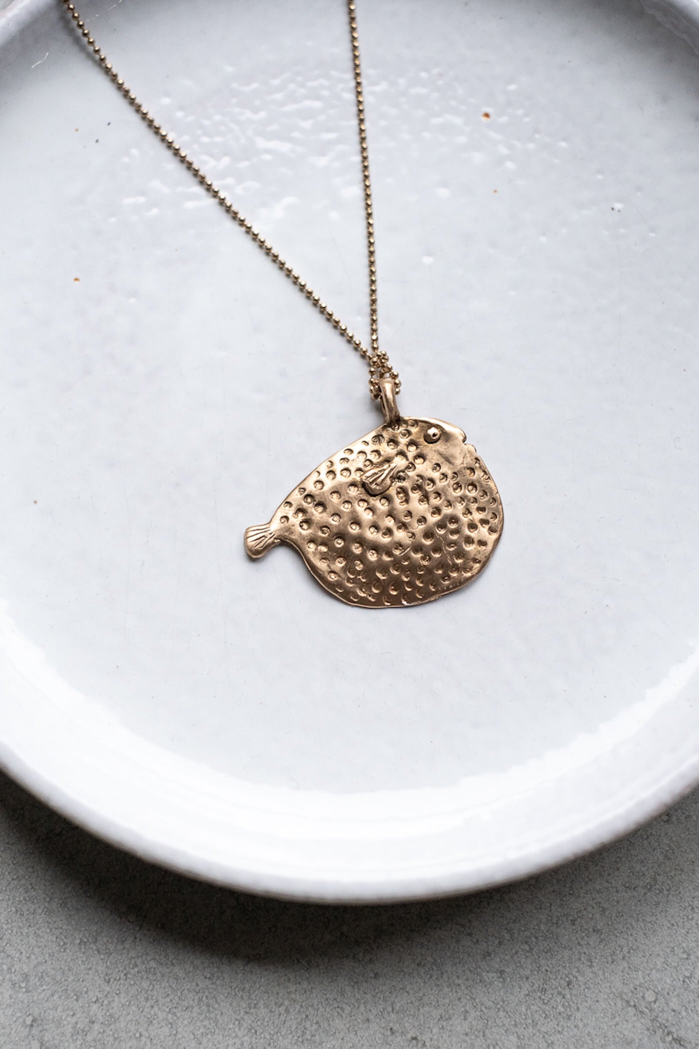 Whimsical and full of charm, the Paffuto Pendant captures the lighthearted spirit of the sea in true Pesci Che Volano style. This limited-edition bronze pendant features a beautifully detailed puffer fish – plump, spiky, and full of personality – symbolising protection, curiosity, and quiet strength. With its rustic texture and handcrafted finish, it’s a joyful piece that instantly sparks conversation and smiles.