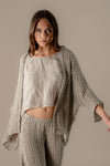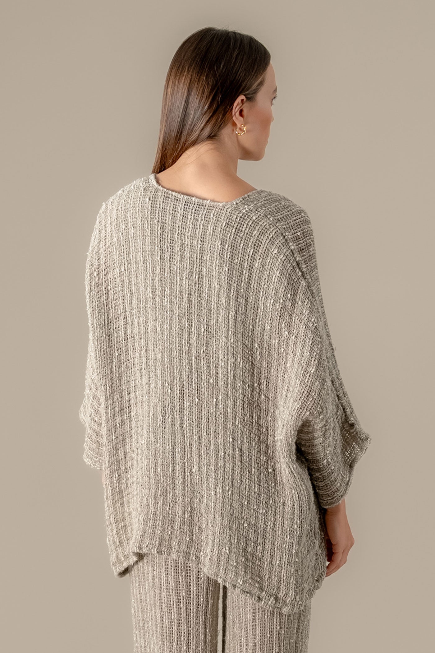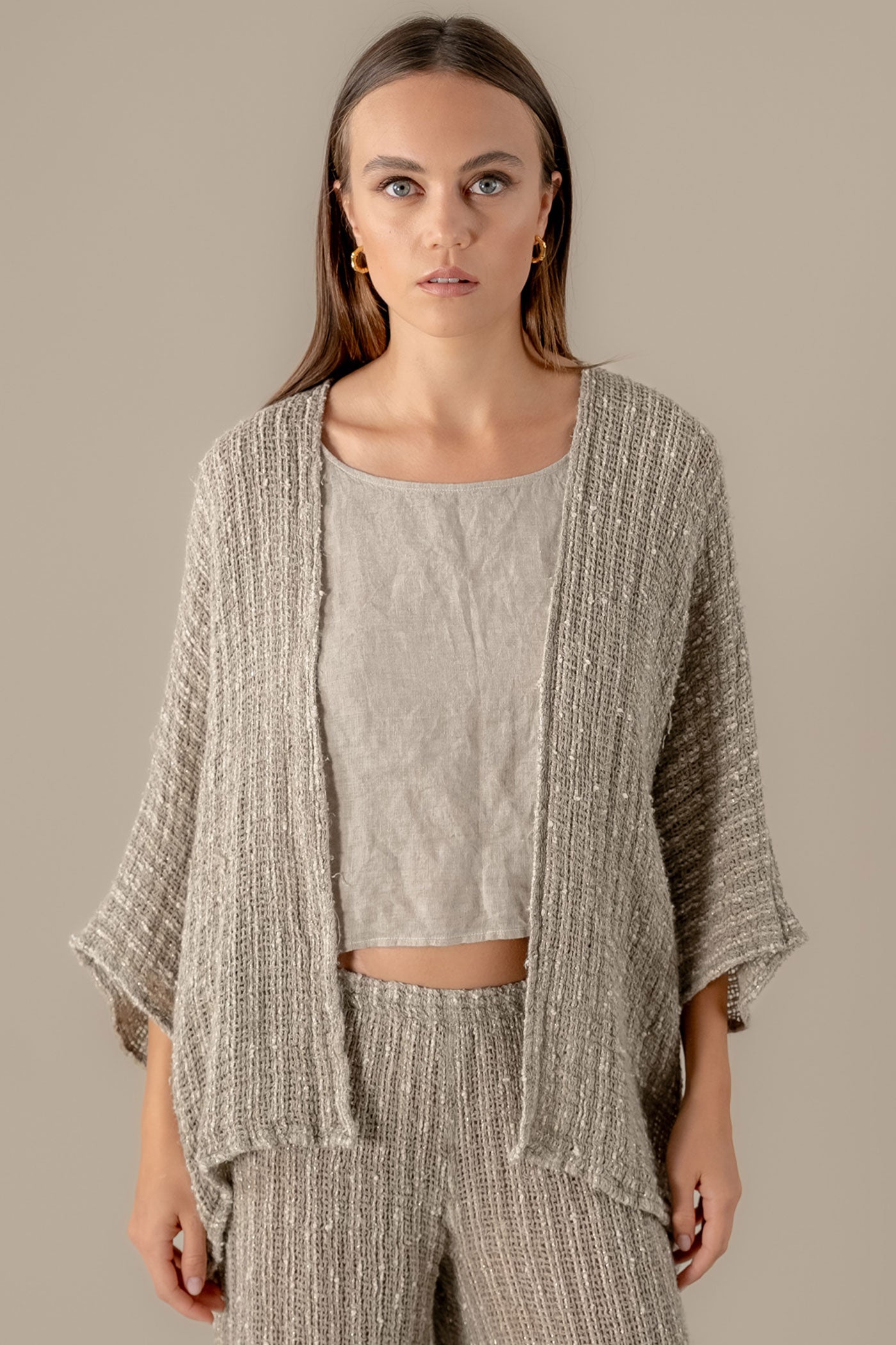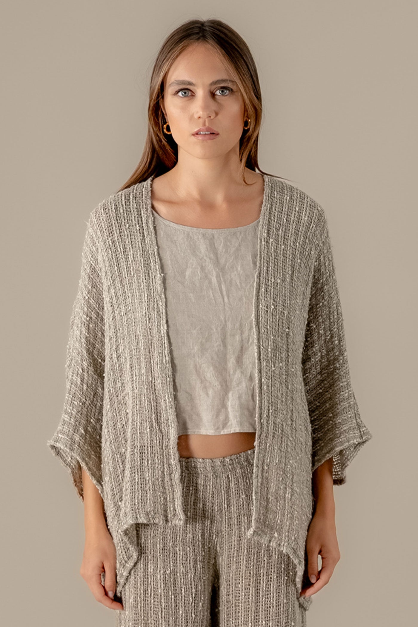 The Giacca Atena Unica Camp Luxor is a one-size jacket with an effortlessly easy silhouette, crafted from a beautifully textured linen knit. The fabric combines warm sand and ivory-toned filaments, creating a subtle interplay of texture and tone. Designed for versatile layering, this piece offers understated elegance and comfort in every wear.