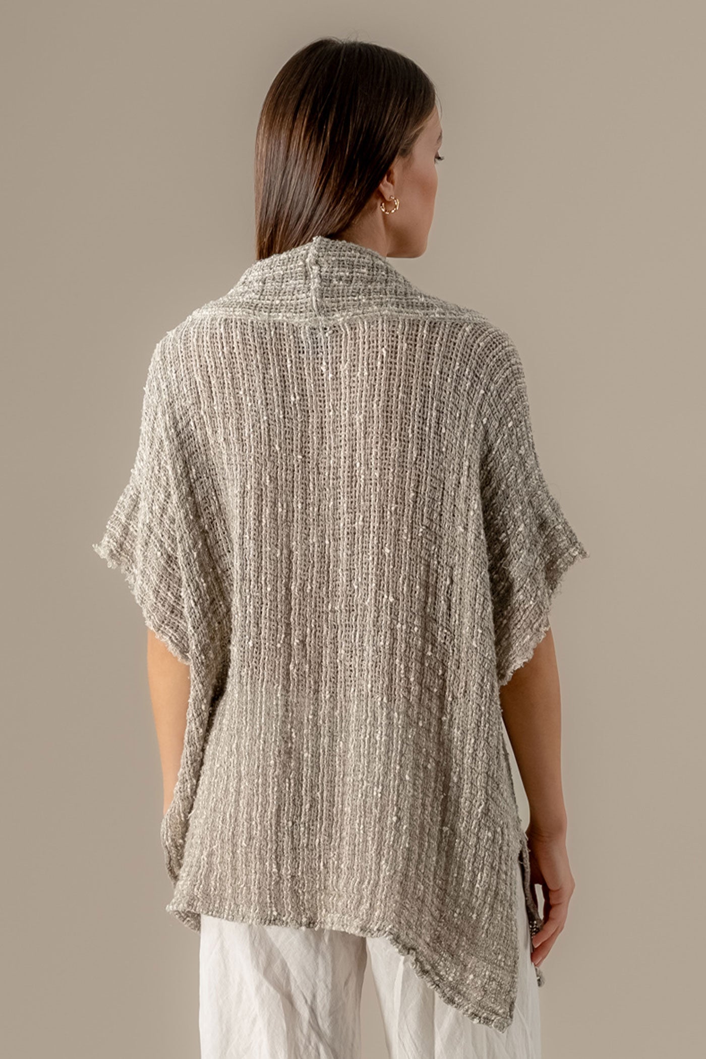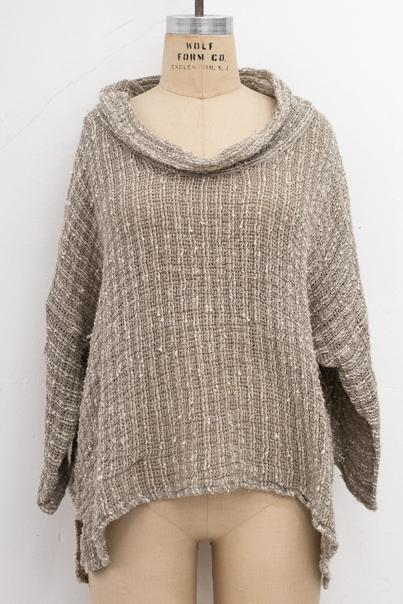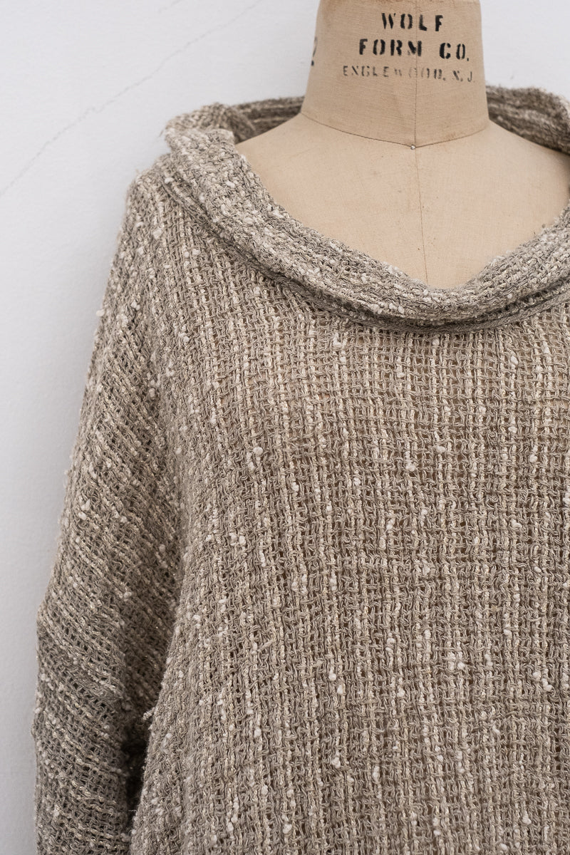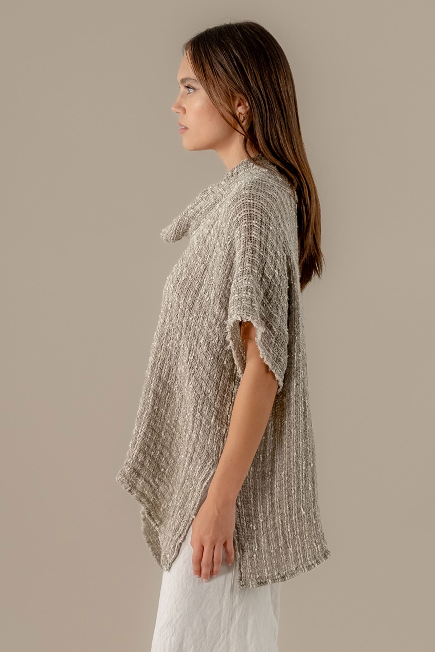 The Maglia Icaro Camp Luxor is a luxuriously textured one-size linen knit, featuring delicate ivory filaments that add subtle depth and interest. Designed with a soft cowl neckline and dropped sleeves, the longer sides create a unique, fluid silhouette that drapes effortlessly. This versatile top embodies understated elegance and timeless Italian craftsmanship.