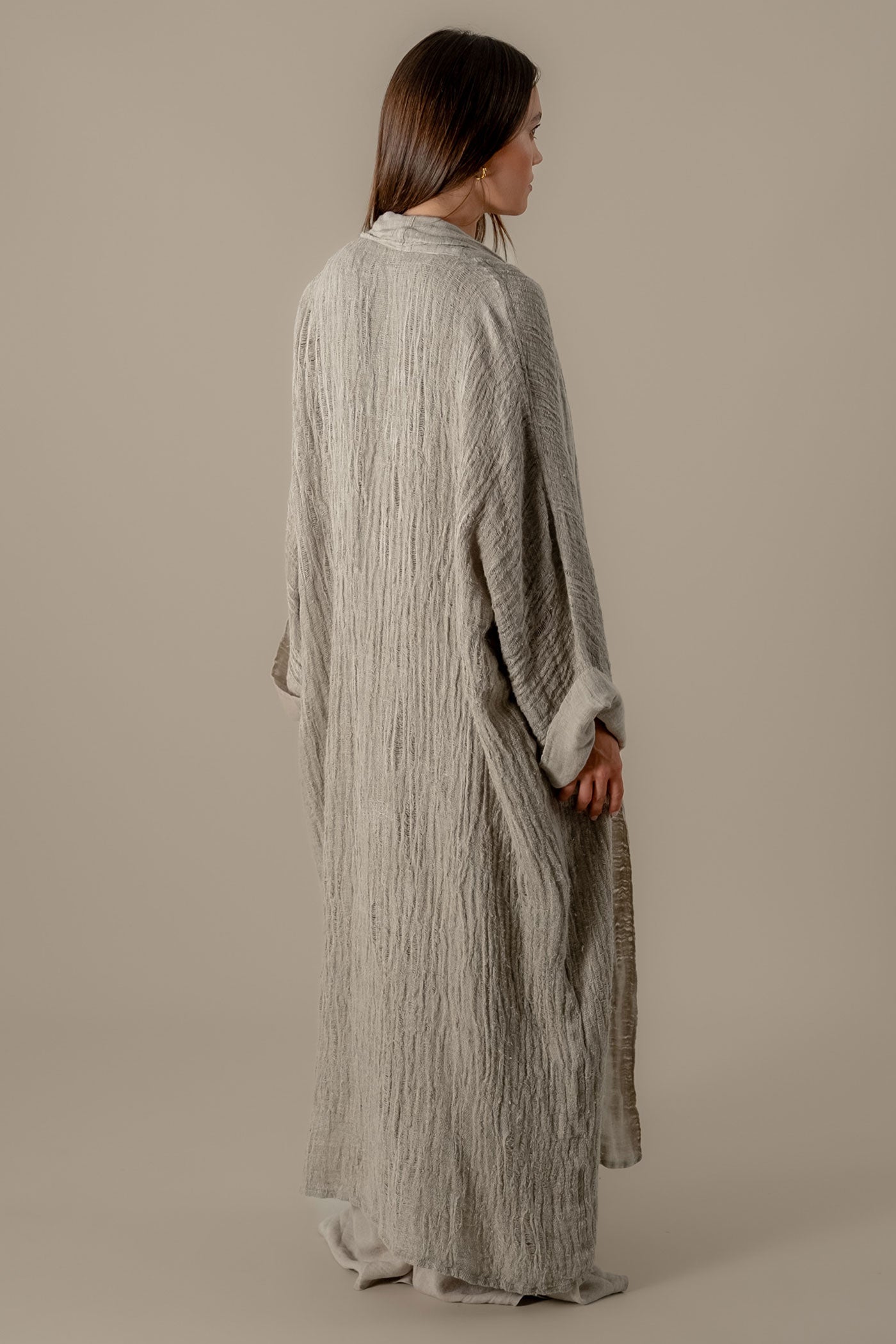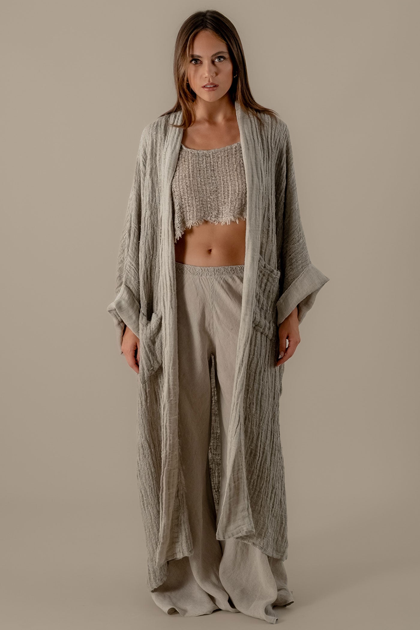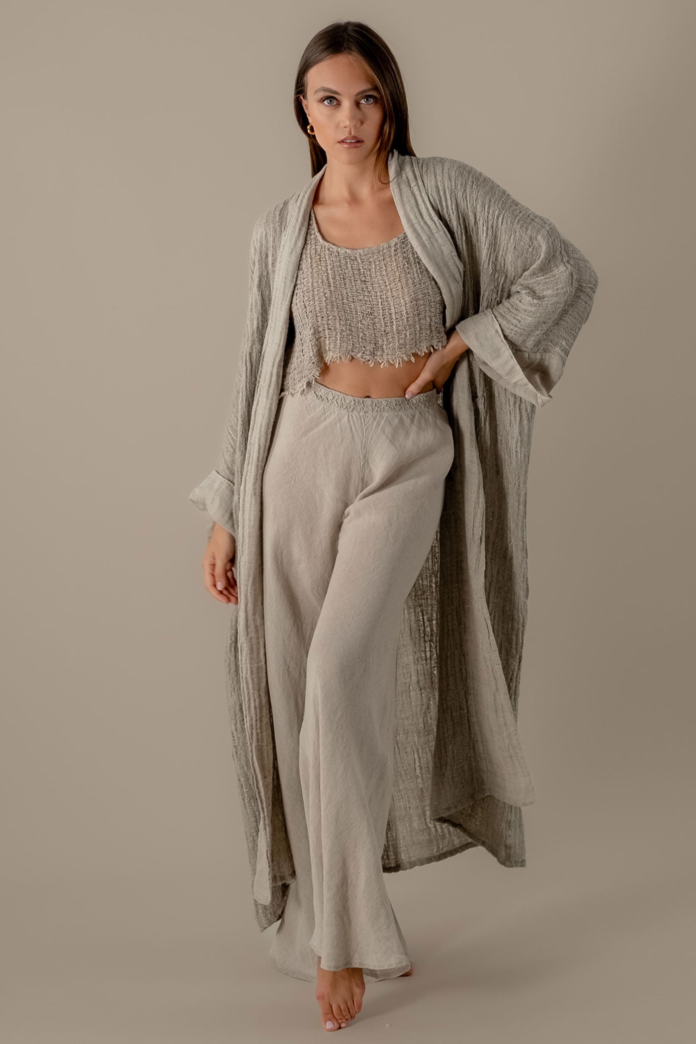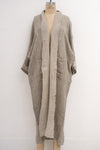 The Spolverino Aquilonia Tela d’Orsey is a stunning one-size duster crafted from two signature La Bottega linen fabrics. The rustic yet soft Tela d’Orsey is complemented by the delicate gauze-style Garzata, featured down the front opening and on the sleeves. Lightweight and effortlessly draping, this piece offers refined elegance and versatile layering for transeasonal wear.