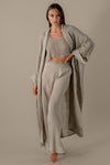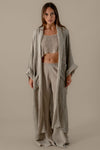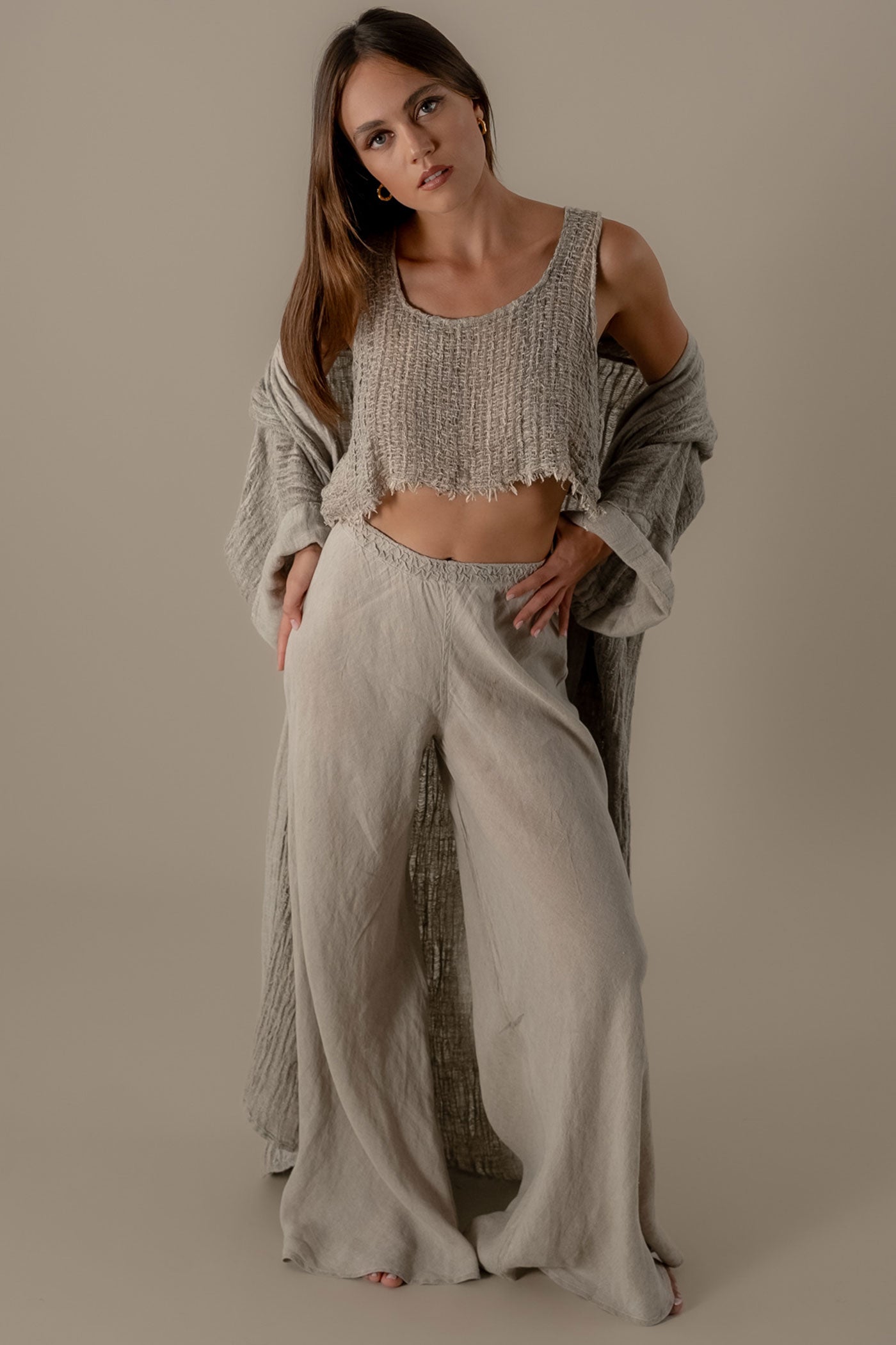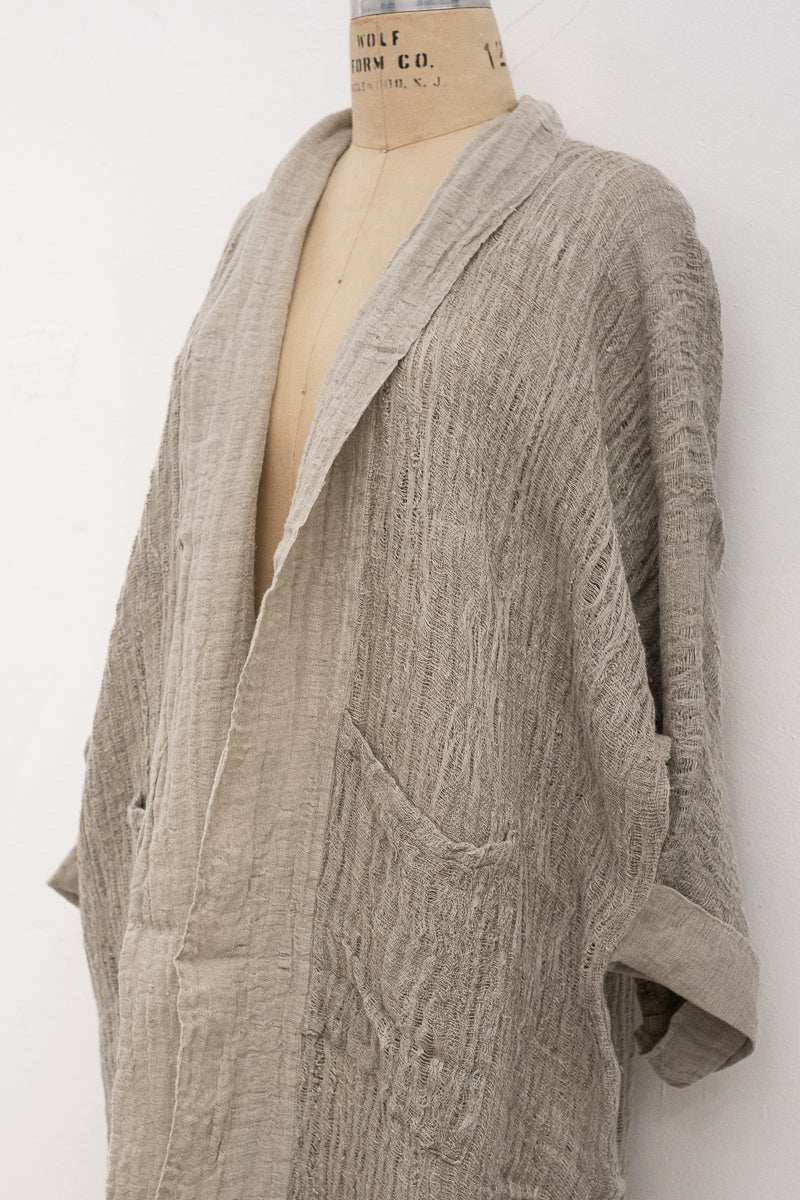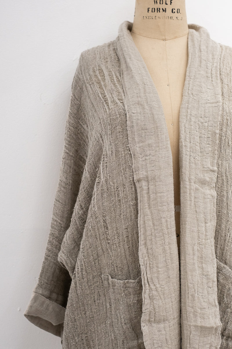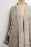 The Spolverino Aquilonia Tela d’Orsey is a stunning one-size duster crafted from two signature La Bottega linen fabrics. The rustic yet soft Tela d’Orsey is complemented by the delicate gauze-style Garzata, featured down the front opening and on the sleeves. Lightweight and effortlessly draping, this piece offers refined elegance and versatile layering for transeasonal wear.