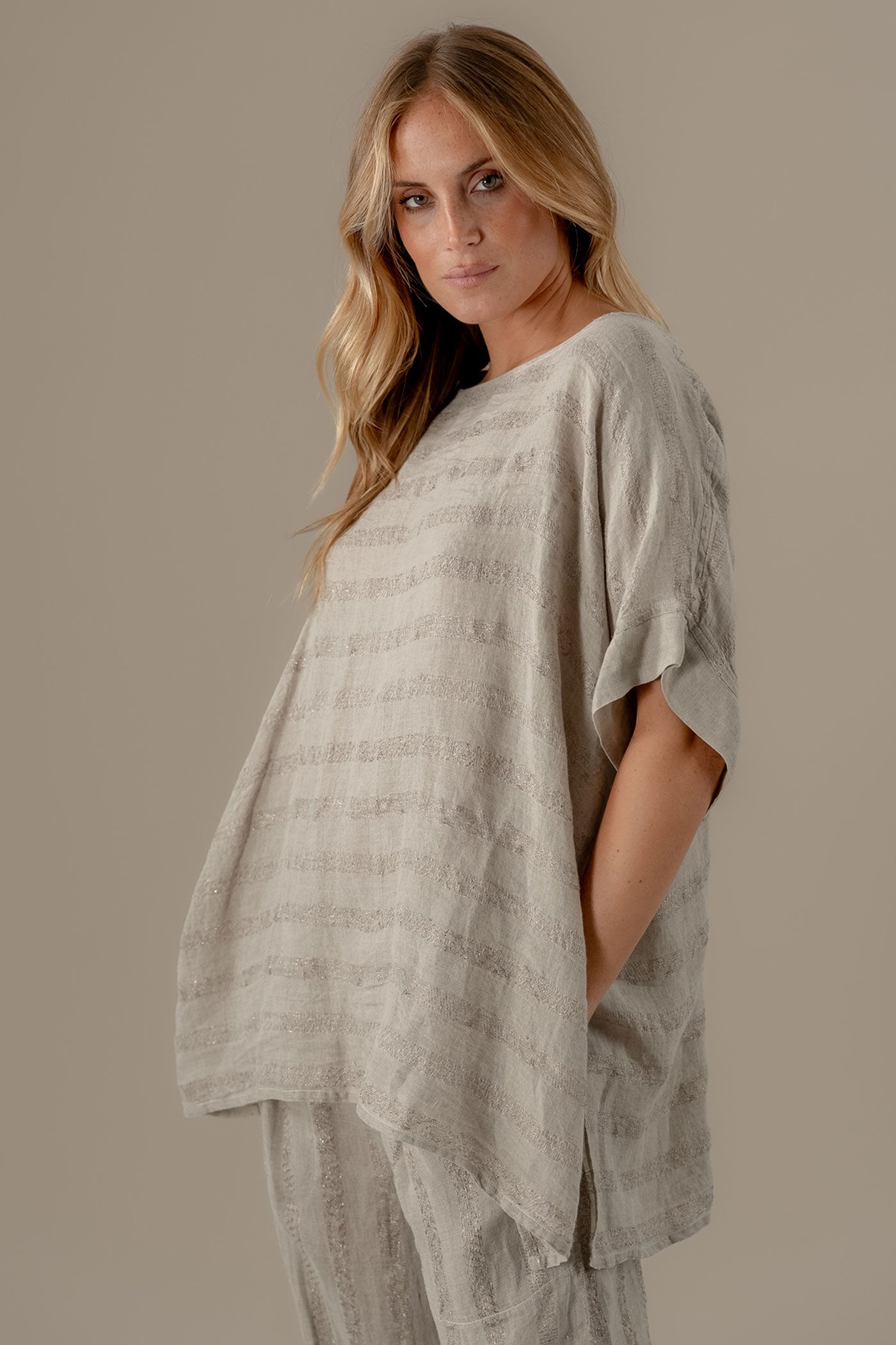 The Camicia Pneuma Riga Luxor is an effortlessly relaxed one-size top crafted from a linen fabric featuring delicate stripes woven with a softly shimmery filament. Slightly longer at the back and finished with sleeve details in plain Battista linen, this piece combines texture and contrast for a refined, understated look. Light, breathable and versatile, it’s perfect for effortless transeasonal dressing.