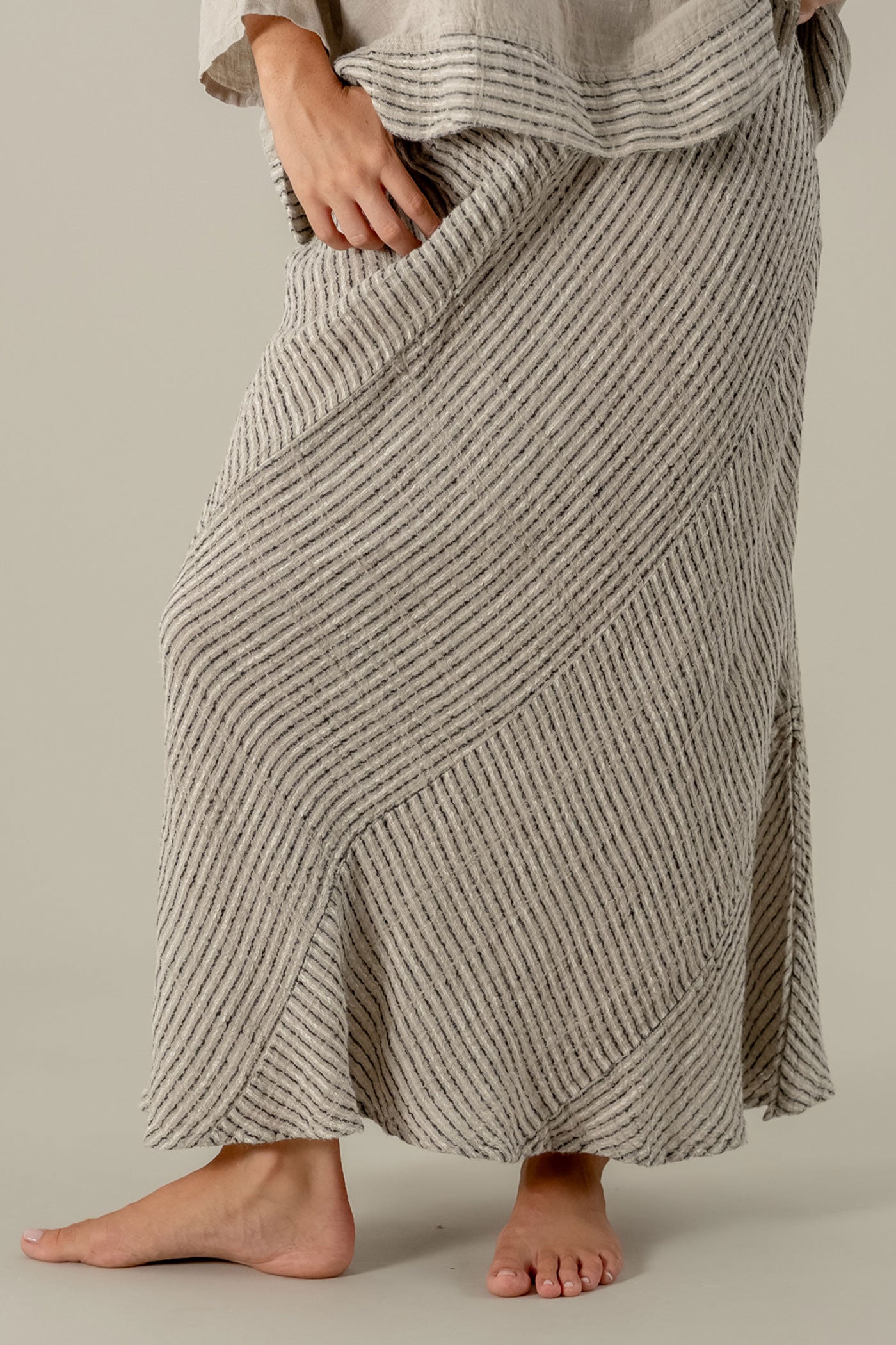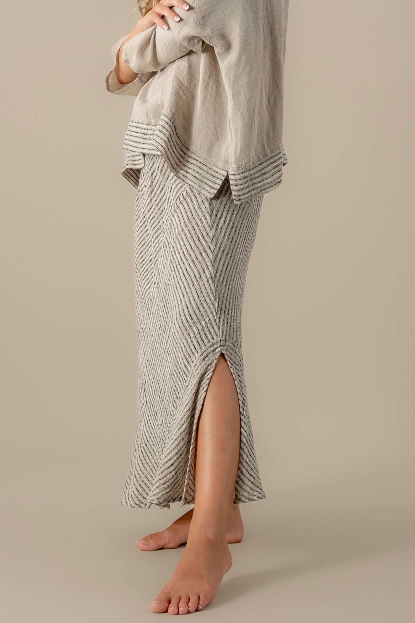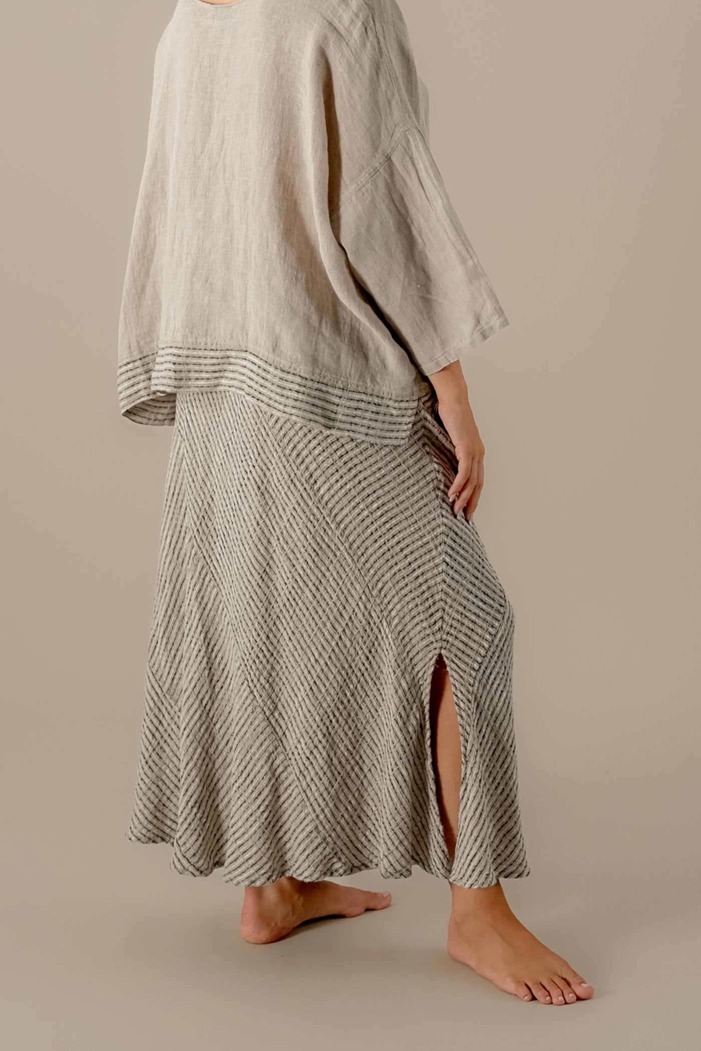 The Gonna Kardake Nilo is a timeless one-size skirt, beautifully cut on the bias to flatter every body shape. Thoughtfully designed with soft, flowing panels and subtle side slits, it moves gracefully with every step. The textured linen fabric features refined charcoal and ivory stripes, offering a look that’s both relaxed and effortlessly elegant.