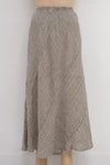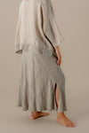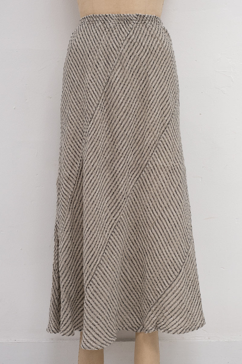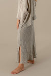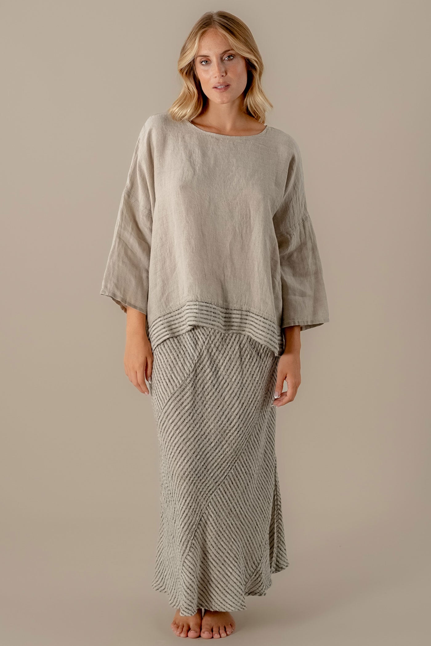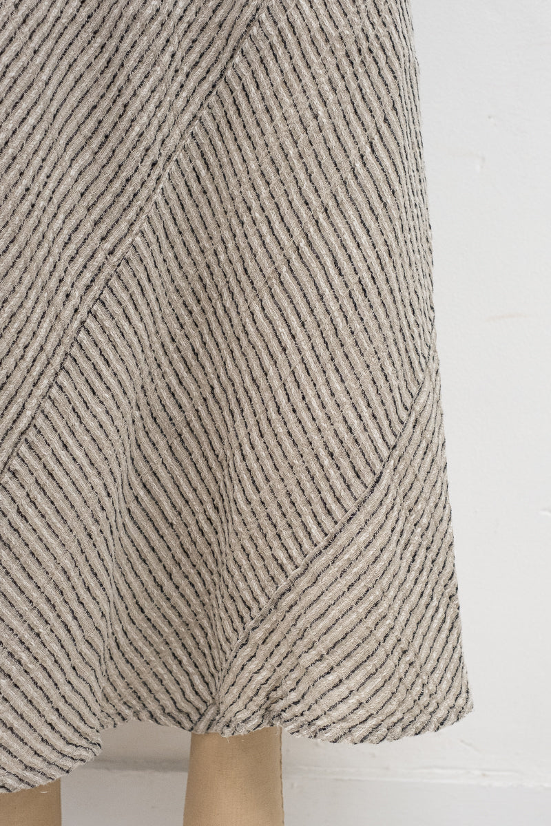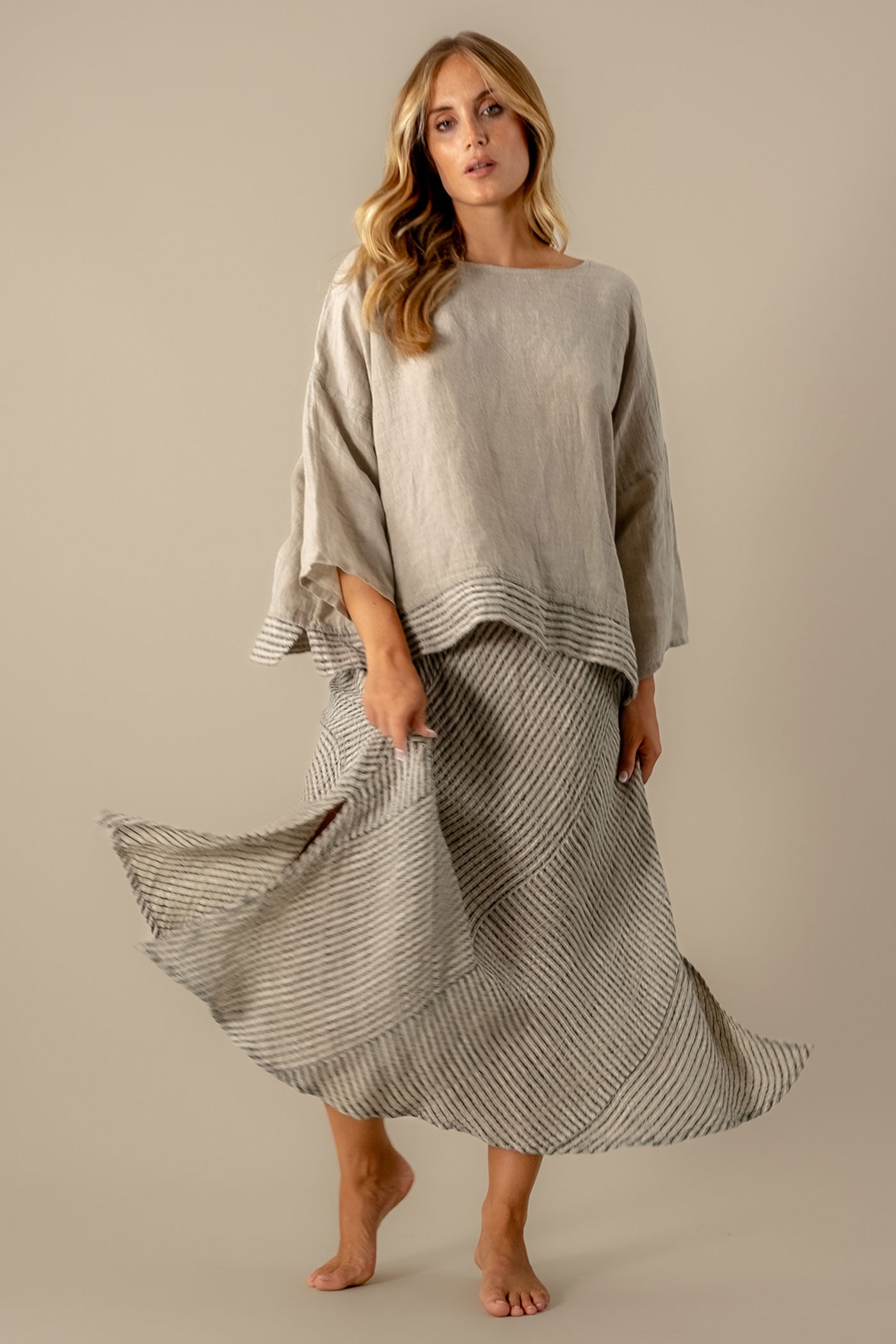 The Gonna Kardake Nilo is a timeless one-size skirt, beautifully cut on the bias to flatter every body shape. Thoughtfully designed with soft, flowing panels and subtle side slits, it moves gracefully with every step. The textured linen fabric features refined charcoal and ivory stripes, offering a look that’s both relaxed and effortlessly elegant.