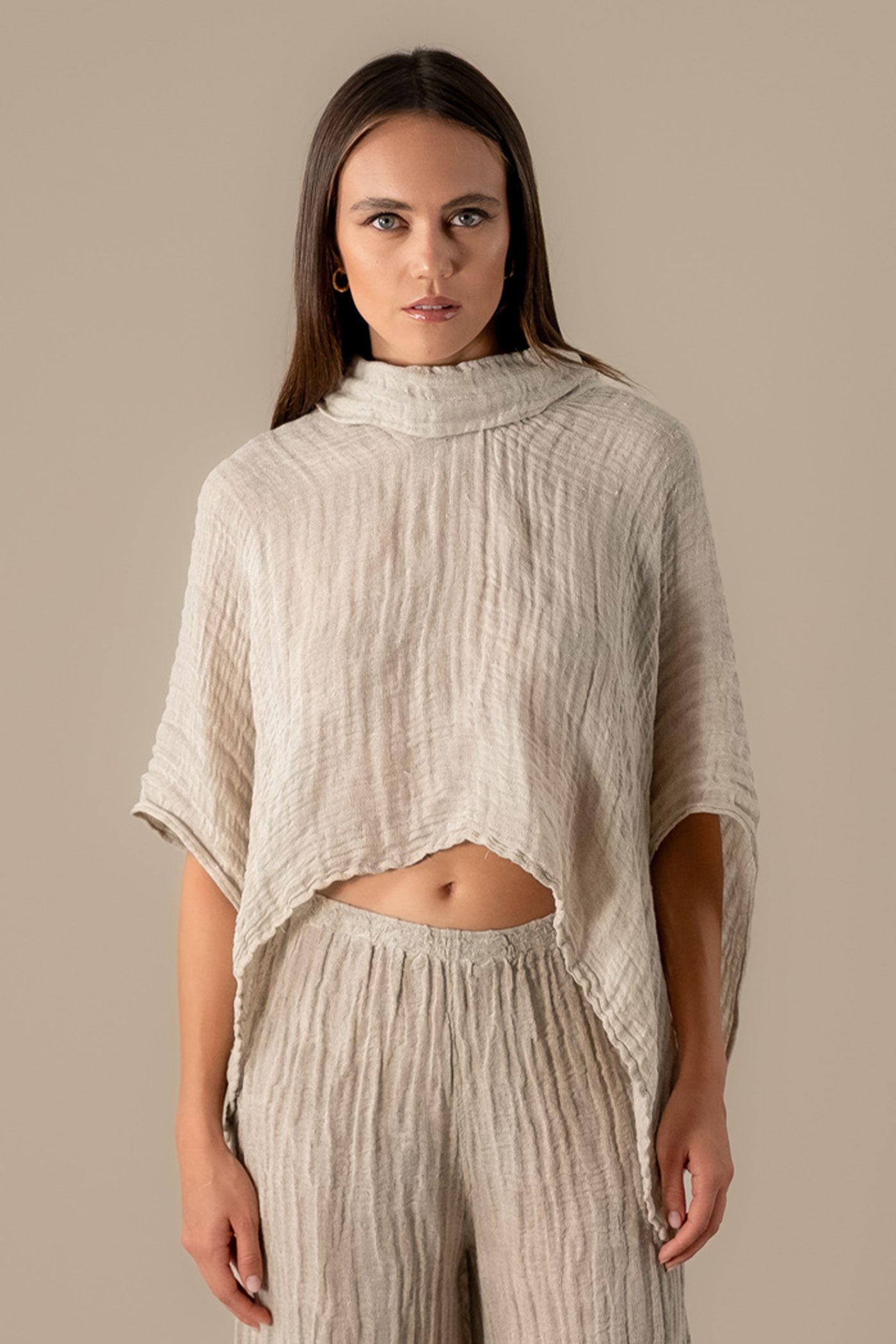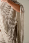 The Poncho Scriba Cairo is a beautifully unique, one-size linen poncho crafted from the soft Cairo linen fabric. Its asymmetric design allows for versatile styling - wear it with the opening at the side, back, or crossed at the back. A subtle cowl neck adds a delicate touch, while the drape and layering potential make it a standout piece for effortless, artisanal elegance.
