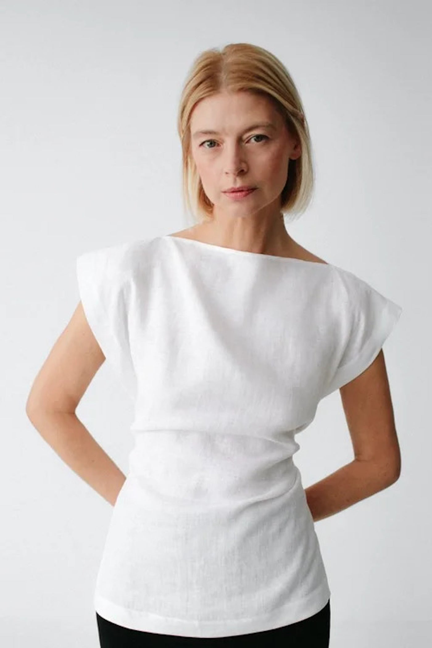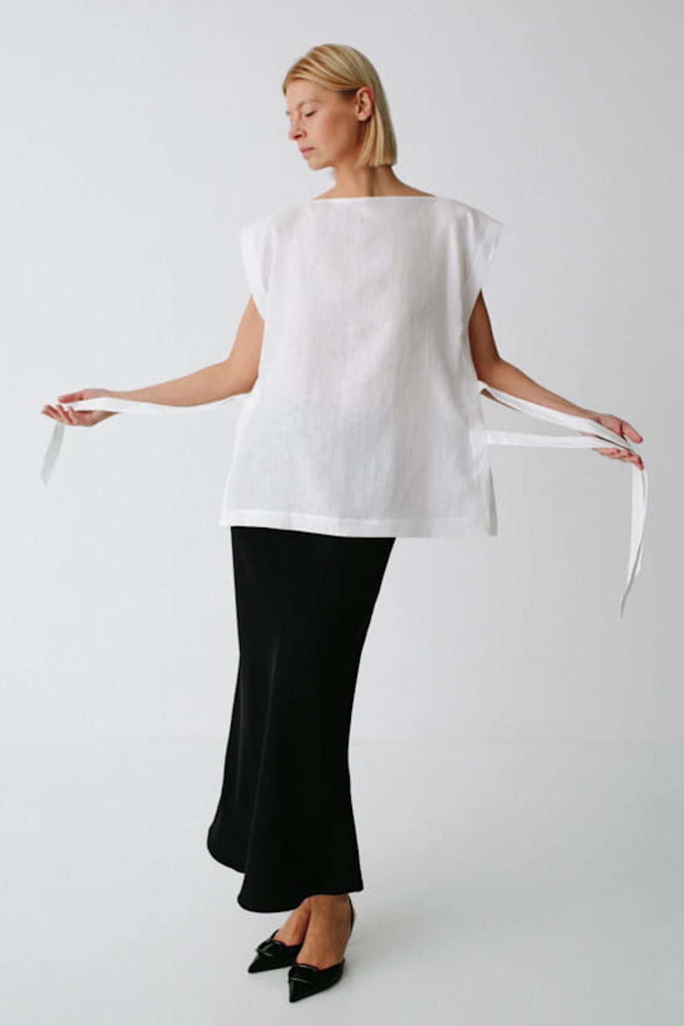 Effortlessly modern and full of character, the Sato Linen Top features a unique asymmetrical cut and adjustable side ties. Designed with three straps – one on one side and two on the other – it can be styled tied at the back for a defined silhouette or left loose for an easy, relaxed feel.