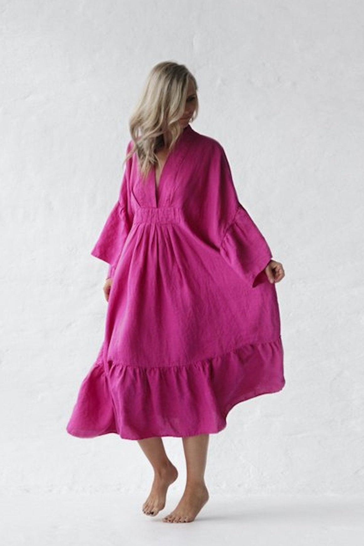 Oversized, flowy linen dress in neon pink. Features flattering V-neck and bell sleeves. Made of 100% super soft Baltic linen.