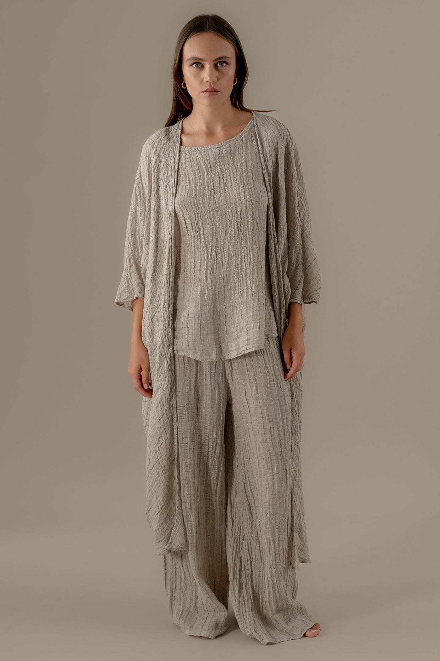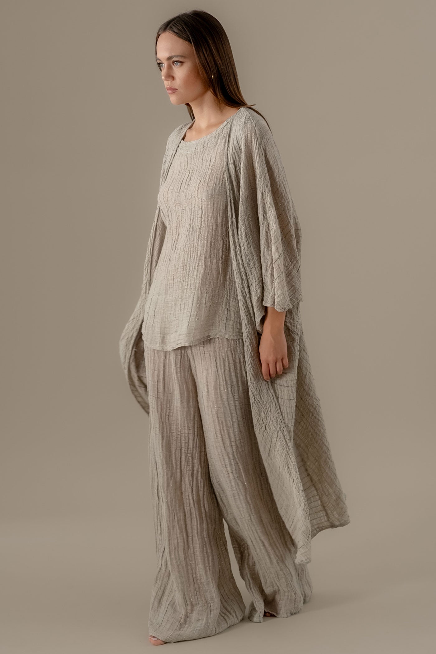 The Spolverino Holiday Garza Egitto is La Bottega di Brunella’s signature long duster, crafted from an airy, lightweight linen fabric with subtle textured stripes for visual interest. Perfect as a light layer on breezy summer nights, this effortlessly elegant piece drapes beautifully for a relaxed, versatile silhouette.