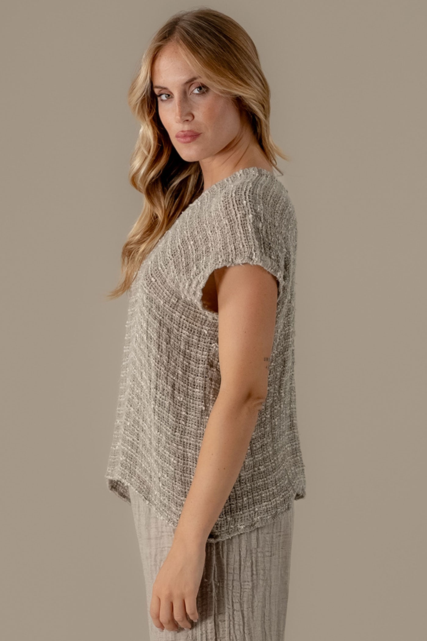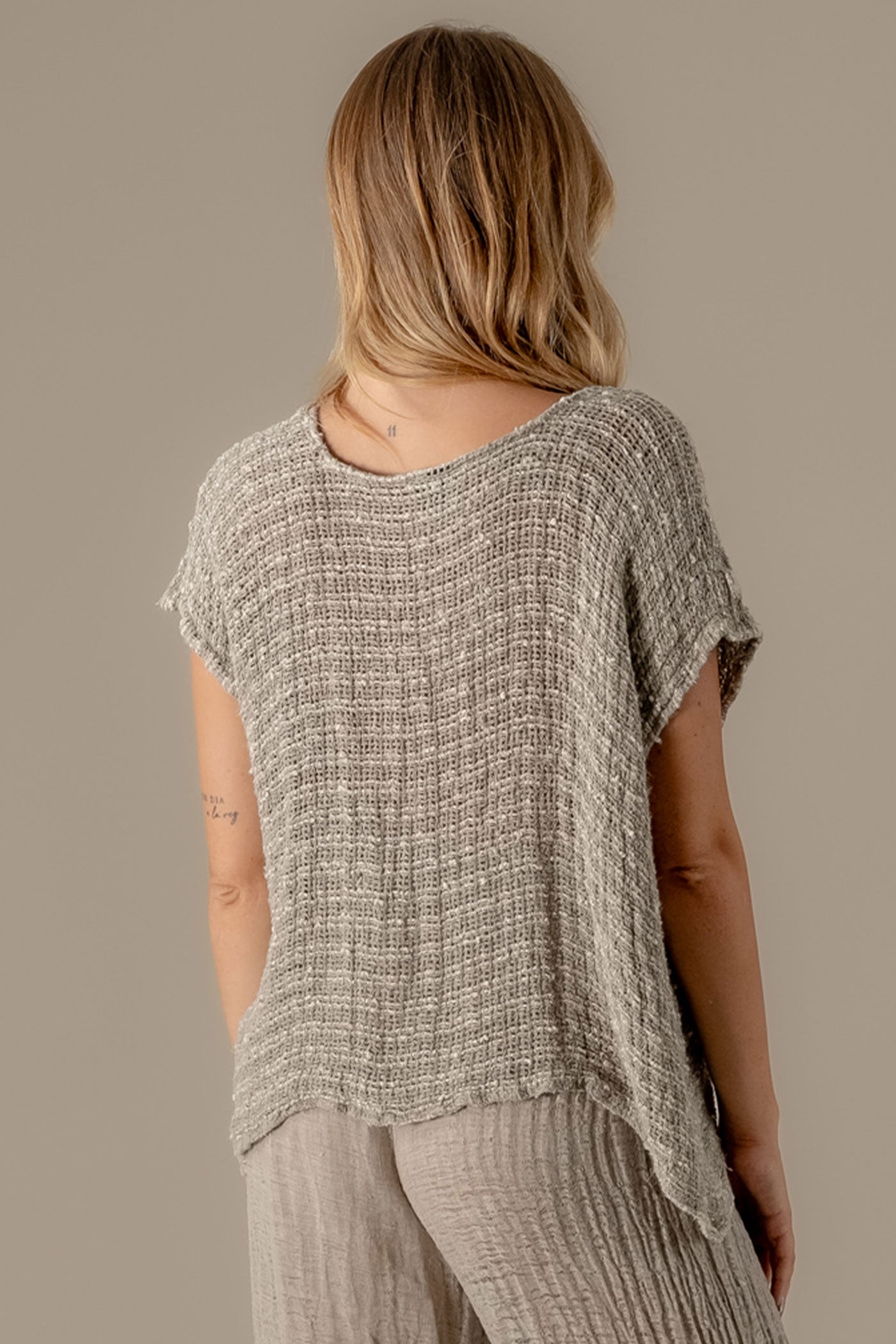The Top Icaro Piu Camp Luxor is a beautifully balanced one-size style crafted from La Bottega di Brunella’s signature textured Camp Luxor linen knit. Designed with the perfect length, it flatters effortlessly while maintaining an easy, relaxed fit. The wide round neckline and softly draping sleeves add a touch of fluidity and understated elegance, making it a timeless wardrobe staple.